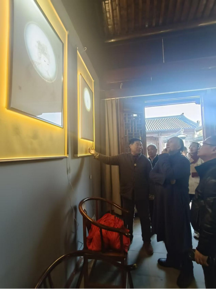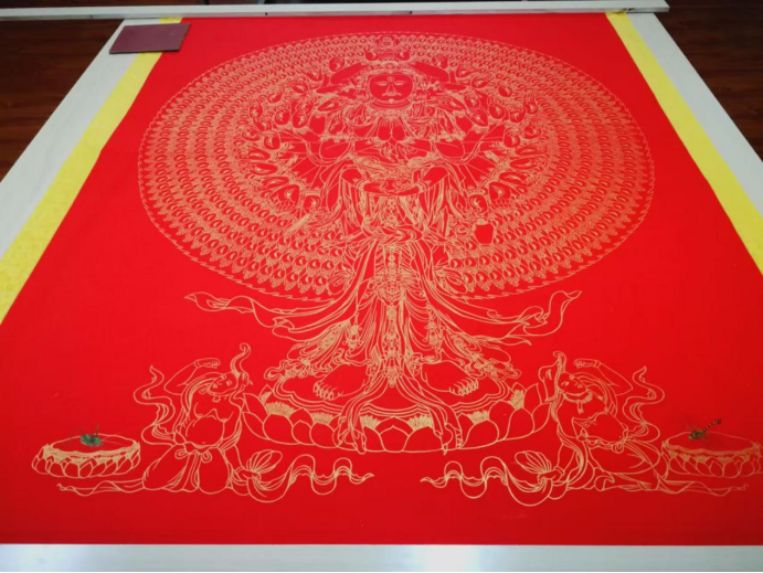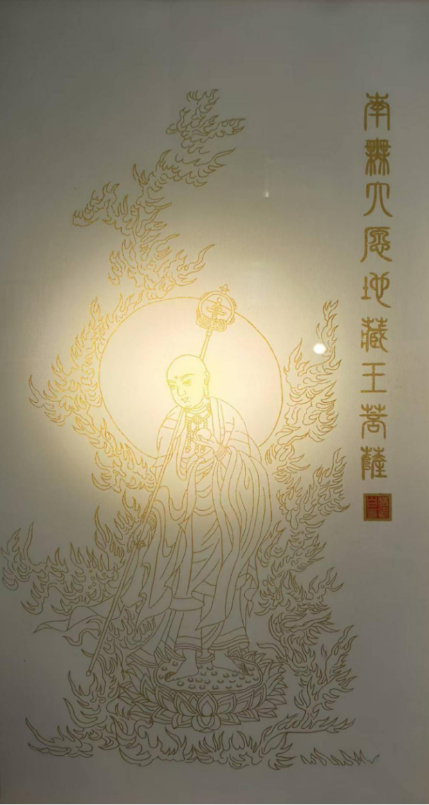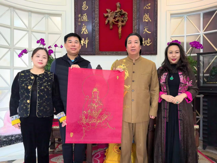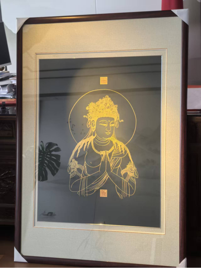 孙怀亮的金系禅意画,线条的起点是对“空”的敬畏。他深谙佛教“色空不二”的哲思,亦明了金箔工艺“薄如蝉翼”的物理特性——98%以上足金箔经“衬、贴、压、揭”四步古法处理后,金层仅几微米厚,却能在光线折射下呈现“既存又隐”的微妙质感。这种材质特性与禅宗“即色是空,即空是色”的理念天然契合,成为线条空灵的先天基因。
