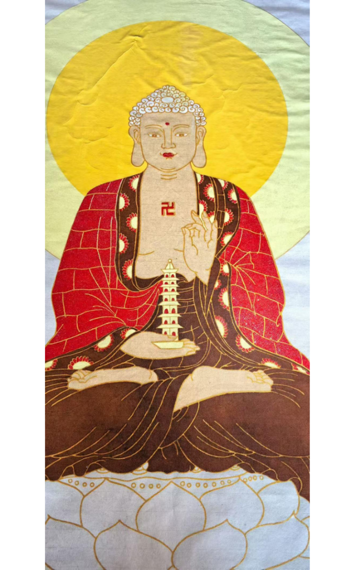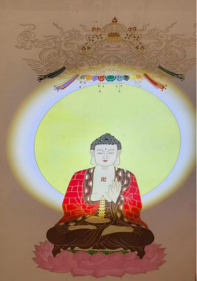 孙怀亮的金系禅意画摒弃繁复构图,以“简”为核心法则。其线条追求“疏可走马,密不透风”的节奏,却无刻意经营的匠气,更似禅者“信手拈来”的自然流露。其作品中的佛像,结跏趺坐于莲花座,仅以简练的金线勾勒面部轮廓与袈裟纹路,蓝肉髻、红黑袈裟的色彩对比虽鲜明,却被金线的“无界性”消解了视觉冲突;背景的云纹以浅淡线条点缀,若有若无,恰如禅诗“云在青天水在瓶”的物我观。还有白色佛身披红色袈裟这幅作品,金色线条仅在衣缘、手印处勾勒,其余皆留空白,这种“以少胜多”的线条处理,使画面从“描绘佛像”升华为“暗示佛性”——线条不再是“形”的载体,而是“空”的显化。