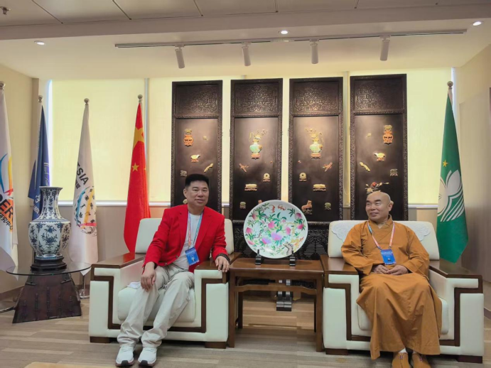 孙怀亮的艺术主张强调“观画即观心”,其作品的能量传输本质上是“精神同频”的过程。这种同频,通过两方面实现:其一,线条与色彩的“非对抗性”。如第1幅的红黑袈裟与蓝肉髻,第2幅的金纹红衣与浅色云纹,色彩对比虽强却因金线的调和而不刺目,线条的繁简互补而非对立,这种“和谐的张力”使观者情绪趋于平和,为能量接收创造心理基础。其二,佛教符号的普适性。作品中反复出现的莲花(象征清净)、卍字(象征吉祥)、云纹(象征无常)等符号,是人类共同的精神密码。当观者面对这些符号时,个体的生命经验被激活,与作品传递的“禅意”产生共鸣——这种共鸣,即是孙怀亮所言的“智慧能量传输”:作品不是单向输出,而是邀请观者参与一场跨越时空的精神对话。三千世界:金画作为当代的“智慧载体”