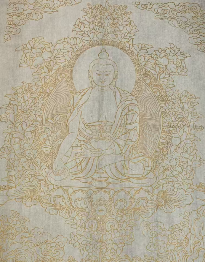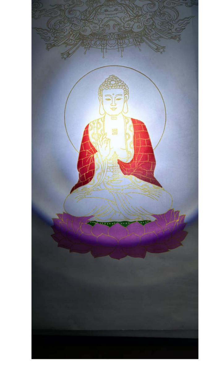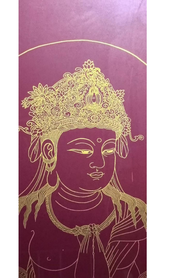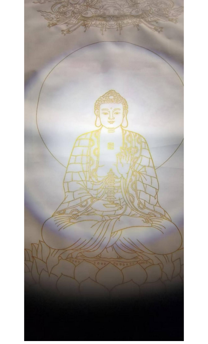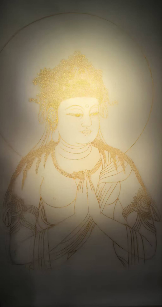 佛系金画的基底多选用宣纸、绢本或木板,经防虫防潮处理后,以“衬、贴、压、揭”四步古法敷贴98%以上足金箔。这种工艺使金层薄至0.1微米级,呈现出“薄如蝉翼、轻若游丝”的物质特性。孙老师的作品中,佛陀头部及肩部以纯金线条勾勒,耳饰的垂坠感、衣领的转折褶皱,乃至眉梢的细微弧度,皆因金箔的薄透而避免了金属的沉重感,反似“空中妙有”的幻相——金线非“实存”,而是承载精神意象的“虚媒介”。正如孙怀亮所言:“金箔不是装饰,是用最接近‘空’的物质,去承载最丰沛的‘有’。”这种物质性的“空”,为线条的空灵性奠定了物理基础。