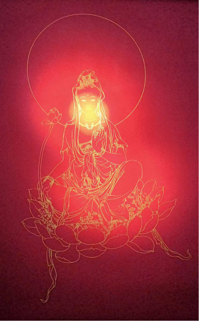 孙怀亮老师的作品中,这种“三千世界”的隐喻处处可见:复杂云纹与浅色线条,象征“三千大千世界”的纷纭;粉色莲花与灰白背景,暗喻“一沙一世界”的微明;观音的“观世音”题字与方形印章,则以文字强化“观照世间”的使命。孙怀亮曾说:“我的金画不是画佛,是画众生心中的佛性。”当观者凝视这些作品时,看到的不仅是佛像的金容,更是自身与“三千世界”连接的通道——金线的空灵指向“空性”,光晕的能量指向“妙有”,二者交融,恰如《心经》“色不异空,空不异色”的艺术注脚。