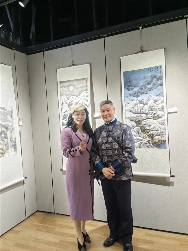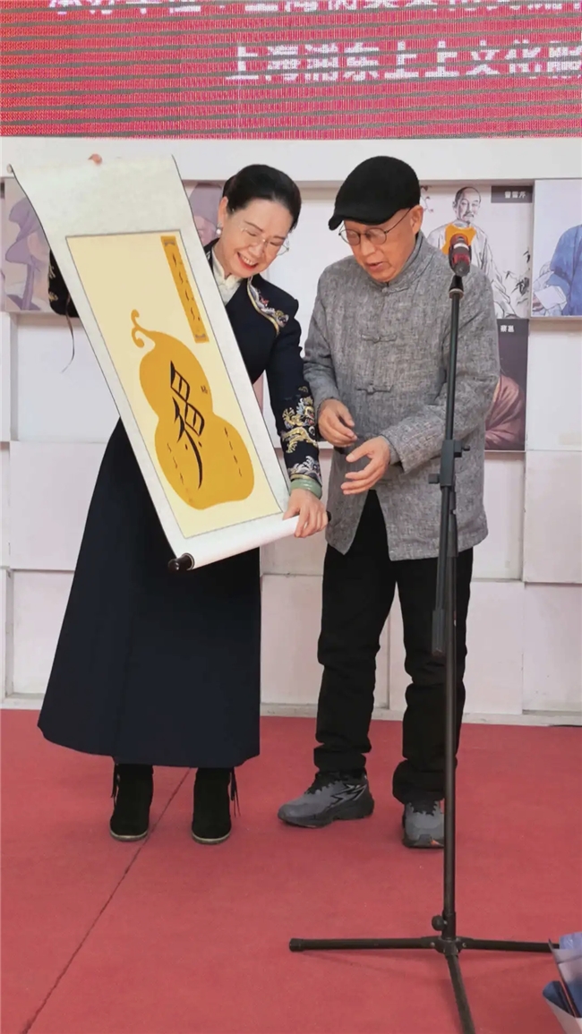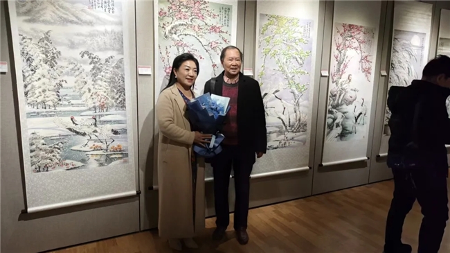 “鹤王”杜信先老师与山东省高密市美协单秋芳副主席在作品前合影留念