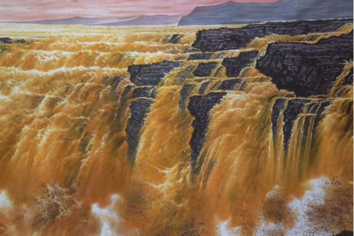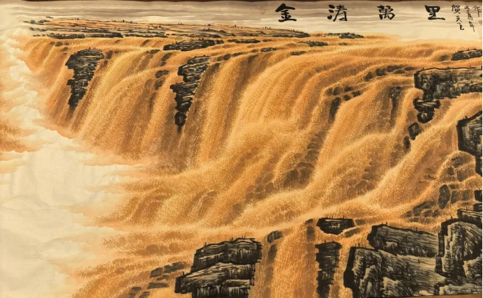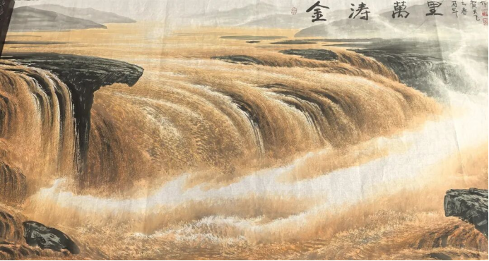 “黄河远上白云间,一片孤城万仞山”,王之涣笔下的黄河雄阔苍凉、气贯苍穹;而在著名书画家贺天飞的《金涛万里》中,这条大河被赋予更炽热的魂魄、更磅礴的气象,以中西合璧的笔墨,绘就一曲山河交响、民族壮歌。