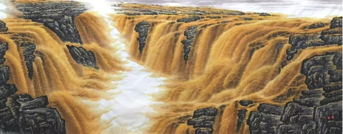 他不写萧瑟苍凉,不绘孤寒寂寥,而是以暖金为主调,让光与浪共舞、色与墨相融,把“春风不度”的边塞幽思,化作山河奋进的时代强音。浪涛间笔力遒劲,线条如书法狂草般跌宕恣肆,水势奔腾有雷霆万钧之势;山峦皴擦厚重,墨色层次丰腴,兼具北派山水的雄浑与当代艺术的视觉冲击力。每一道浪纹都是力量的宣泄,每一抹金辉都是精神的礼赞,将黄河的奔腾不息、中华民族的坚韧不屈,熔铸为可视可感的艺术史诗。