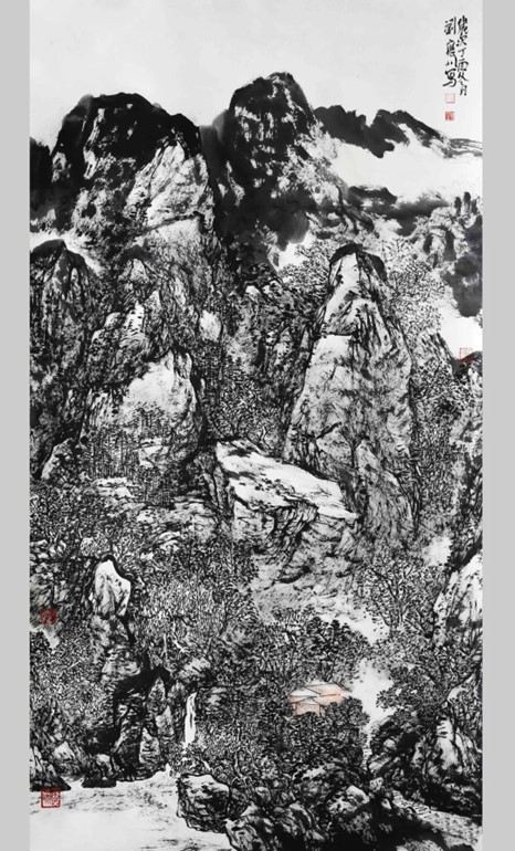 刘应川的画作,鸟意山水、奇花异卉、林园胜景、湖光舟楫成为他抒情寄怀的载体。他笔下的四君子,已形成了个人的构图样式和笔墨程式,充分显示了运笔用墨的文化沉淀。他的作品不仅清气出岫,而且深邃励人,使观者神思情往,耐人品味。他常常采用重组复合、交错叠影的构景法,通过移景、错落、虚实、变幻、反差、对比,造成画面流年似水的沧桑感与厚重感。艺术手法上,运用水墨与色彩,点面与线条交错,将翠木、峰林、花卉诗意化境连成整篇。表现山乡曲水灵秀之美,充满了抒情的色调,透着一种灵动的生气,让观者得到空净明理,神情独钟的享受。《鸟意山水》《碧水金荷》,临《匡庐图》《四君子》《梦里梅江正入秋》等均为这一类型的代表作,总体风格清新明快、宁静悠远,在山水画的抒情性、诗意化表现上有所突破。在笔墨技法与自然景物的描绘上,着意于境界的深幽静谧与笔墨的交融自然,进而形成了清纯雅逸的格调。刘应川的书法作品笔墨淋漓、洒脱自如。大幅作品墨韵浓烈、气势磅礴,小幅作品笔道遒劲、骨力弥满。或大或小,或工或草,都尽显他对艺术的深刻剖析与探索。