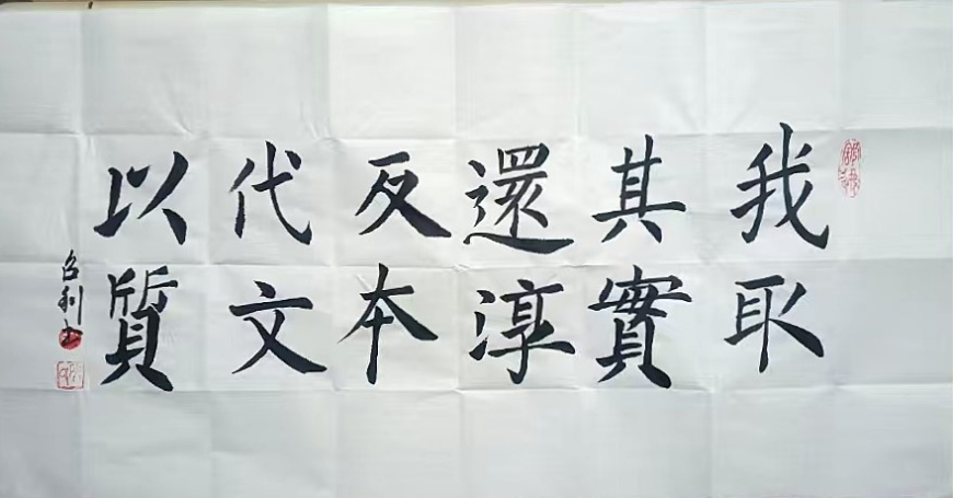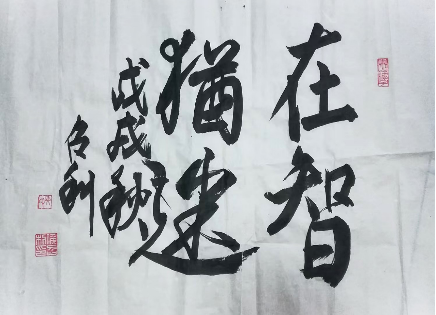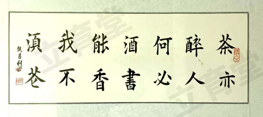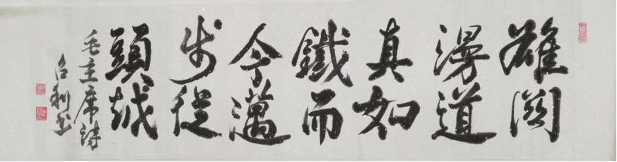 观侯召利先生的书法作品,最动人的莫过于其笔墨间的法度与灵动,刚健与清雅,在对立中实现了完美的统一。他的楷书,笔画厚重饱满,起收顿挫分明,结体宽博开张,中宫收紧,如泰山磐石般沉稳大气,既有唐楷的端庄肃穆,又兼具北碑的金石气息,字字工整却不呆板,端庄却不失灵动。一幅《天行健》,笔力遒劲如铁画银钩,墨色苍润如古玉生光,“自强不息、厚德载物”的文化内涵,通过笔墨的张力缓缓流淌,既有视觉上的冲击力,又有精神上的感染力,尽显刚健笃实的君子之风。而行草书则是他艺术才情的集中彰显,笔法灵动多变,中侧锋并用,提按顿挫间节奏分明,线条或流畅飘逸如行云流水,或苍劲老辣如枯藤盘曲,墨色浓淡干湿的变化,让整幅作品充满了层次感与生命力。他的行草作品,不刻意追求张扬,却自有一股气脉贯通的神韵,字与字之间牵丝映带,顾盼生辉,笔断而意连,墨尽而情在,将“书为心画”的艺术境界诠释得淋漓尽致。隶书创作上,他直追汉隶精髓,融合诸碑之长,笔法藏锋逆入,线条圆润浑厚,蚕头燕尾的特征鲜明,结体方整端庄,布局匀称规整,古朴中见新意,端庄中显灵动,一幅《积健为雄》,寥寥数字,却尽显汉隶的古拙厚重与现代审美的巧妙融合,令人回味无穷。