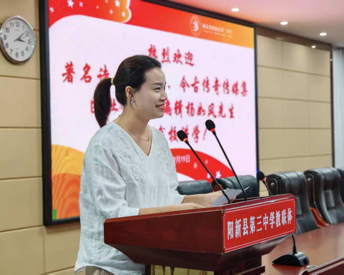 《中华英才》半月刊网湖北讯(通讯员 郑尚锟)为进一步激发学生的文学热情,提升写作素养,营造书香满溢的校园文化氛围,9月19日,阳新县第三中学春晖文学社特邀著名诗人、作家杨如风莅临学校举办了一场别开生面的文学专题讲座。校长余小芳、副校长陈春佳等校领导,与全体文学社成员及部分七年级师生共赴这一文学盛会。