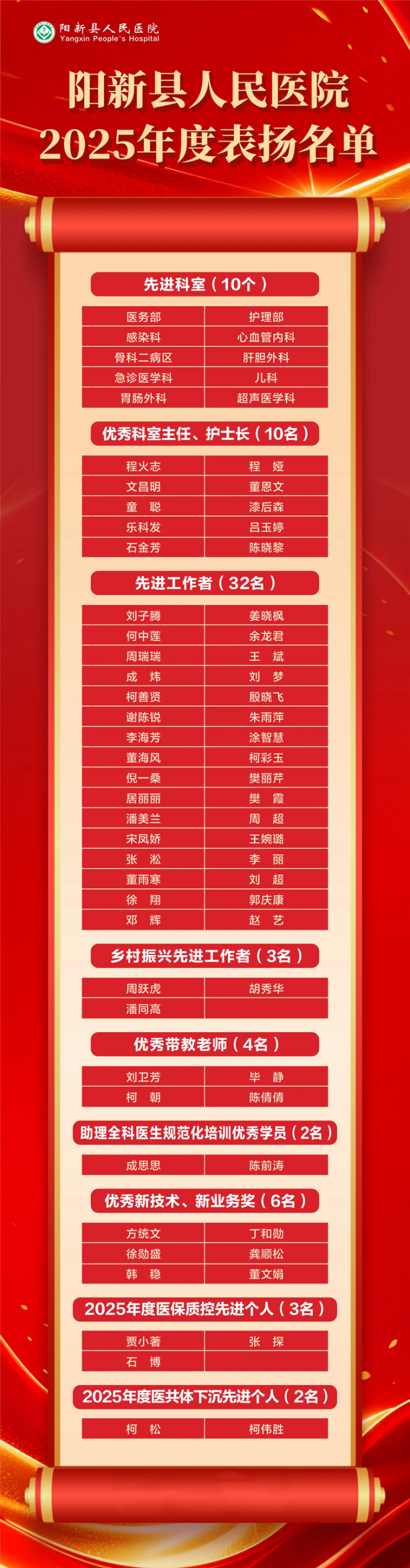 站在“十五五”开局的关键节点,阳新县人民医院全体职工将以先进为标杆、以榜样为力量,凝心聚力、奋楫笃行,充分发挥县域龙头医院示范引领作用,以实干书写医院高质量发展新篇章,用服务守护百万群众生命健康。