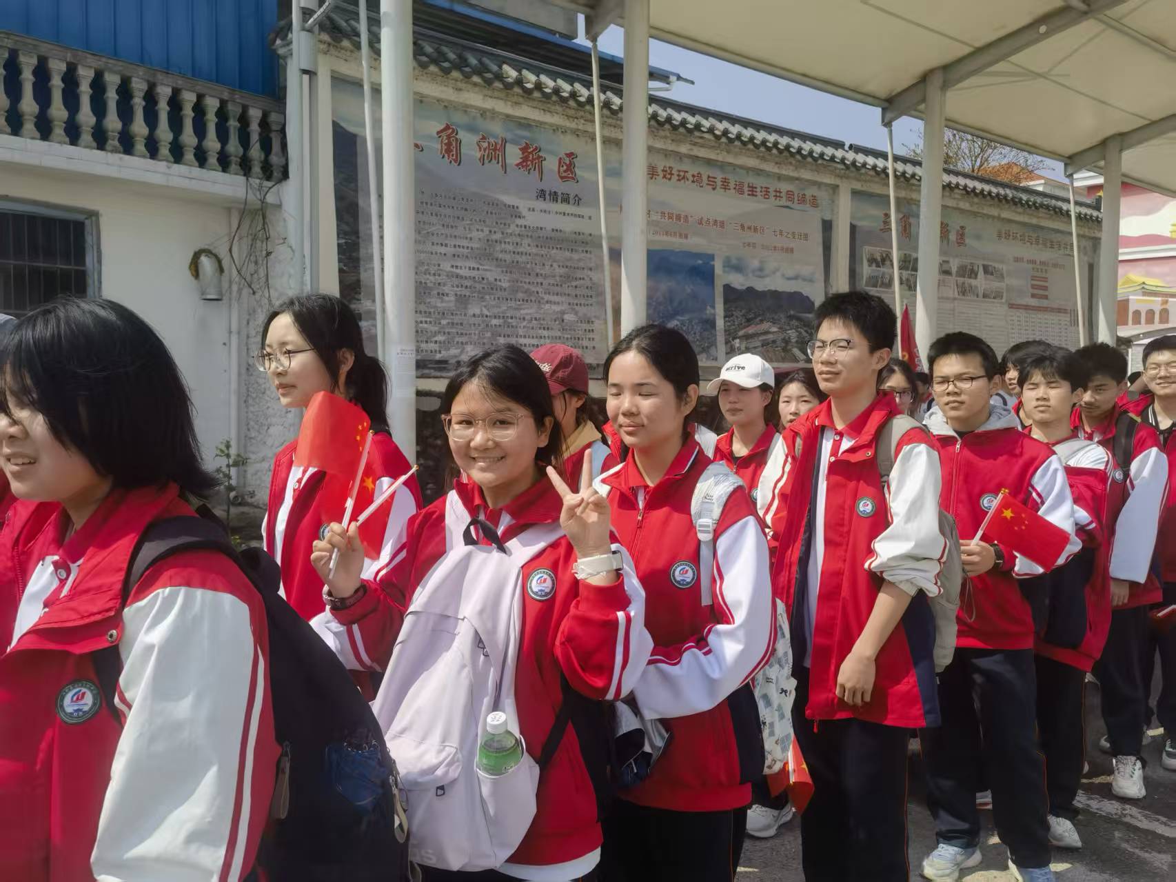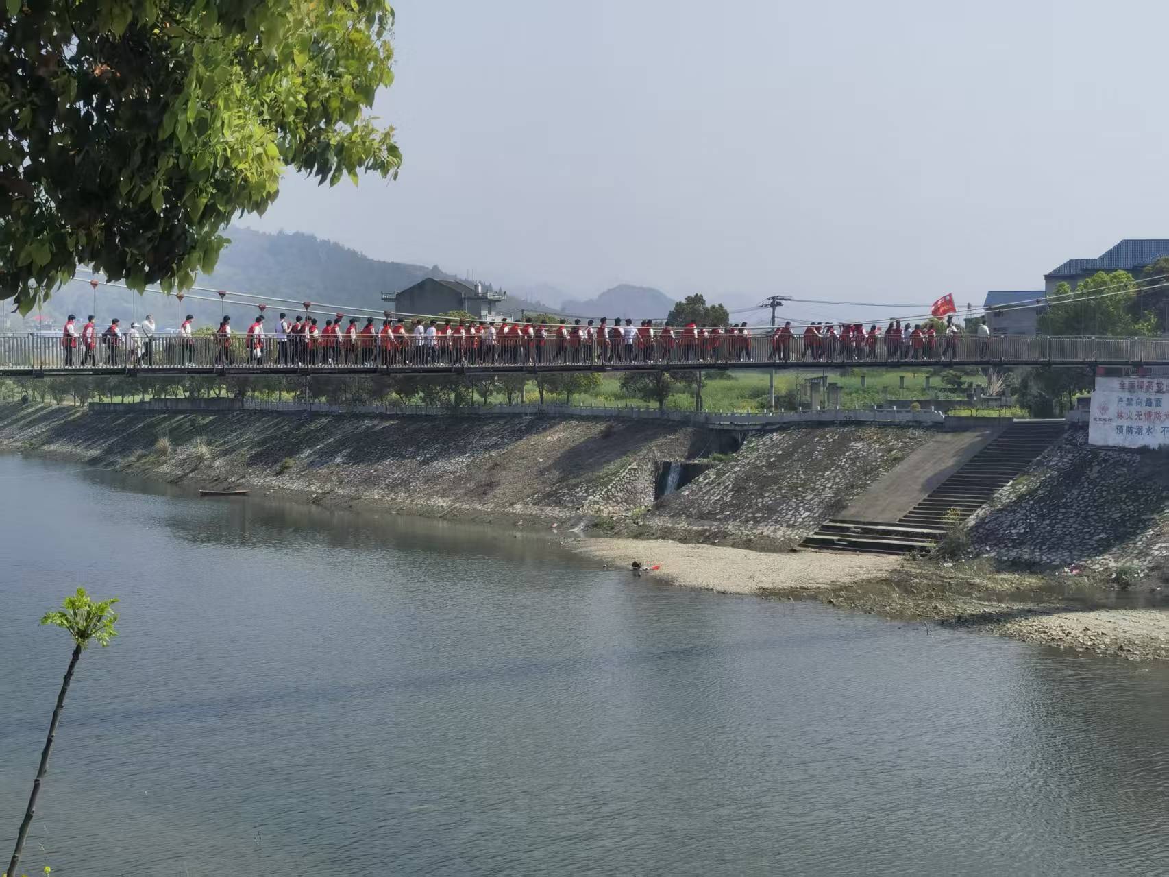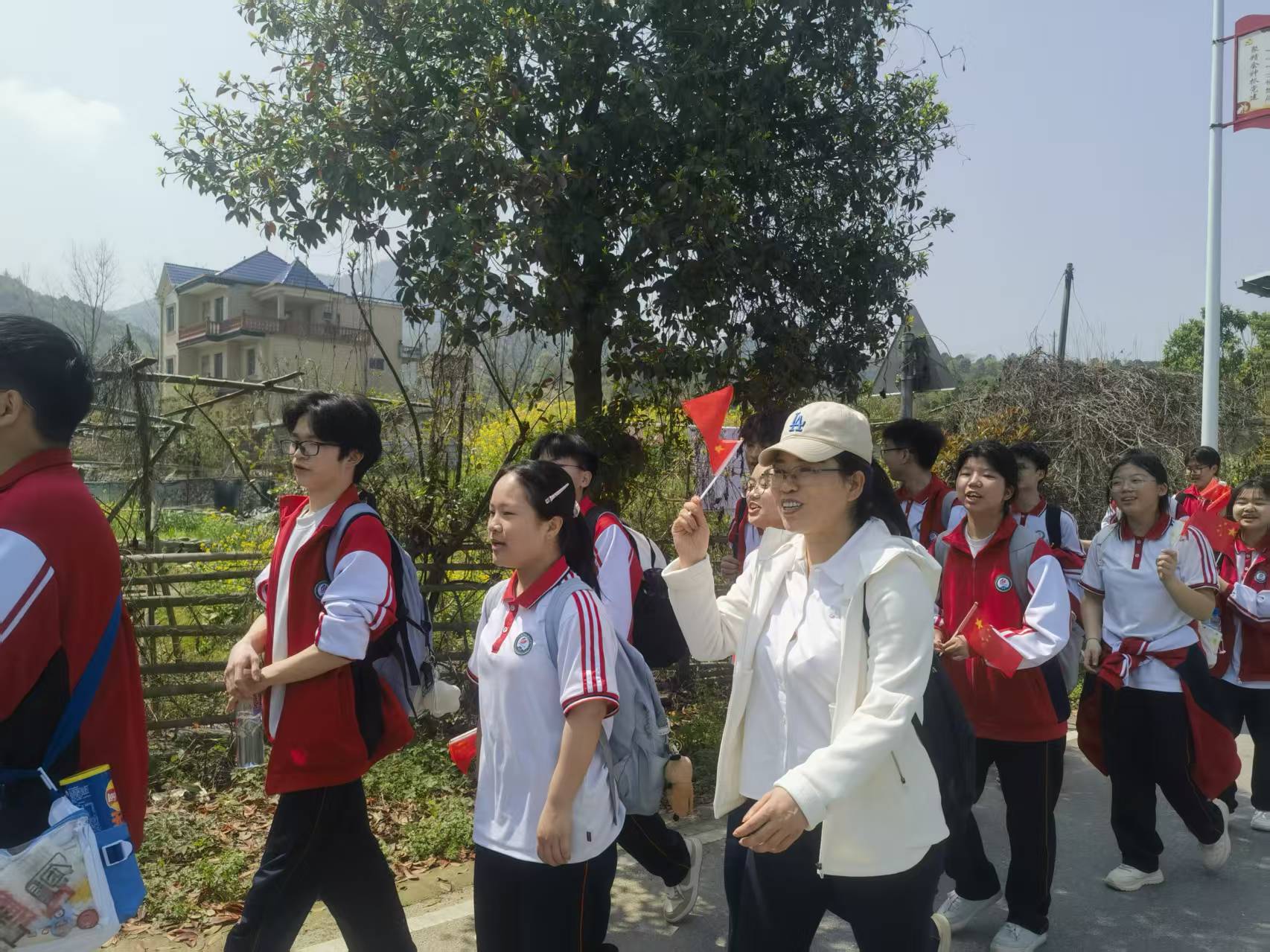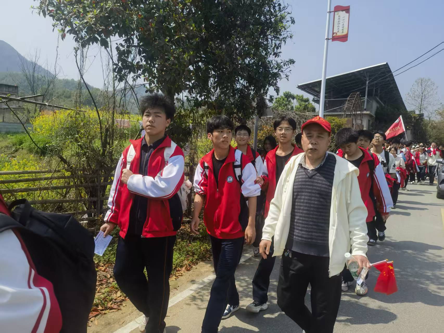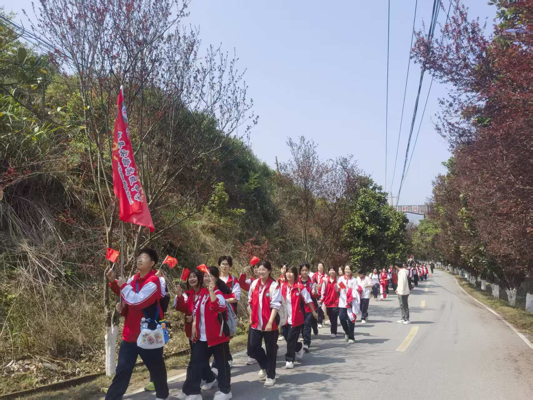 师生们沿红三军团革命足迹徒步行走,途经阮家畈村、汪家垅村、渡口村,全程徒步30华里。