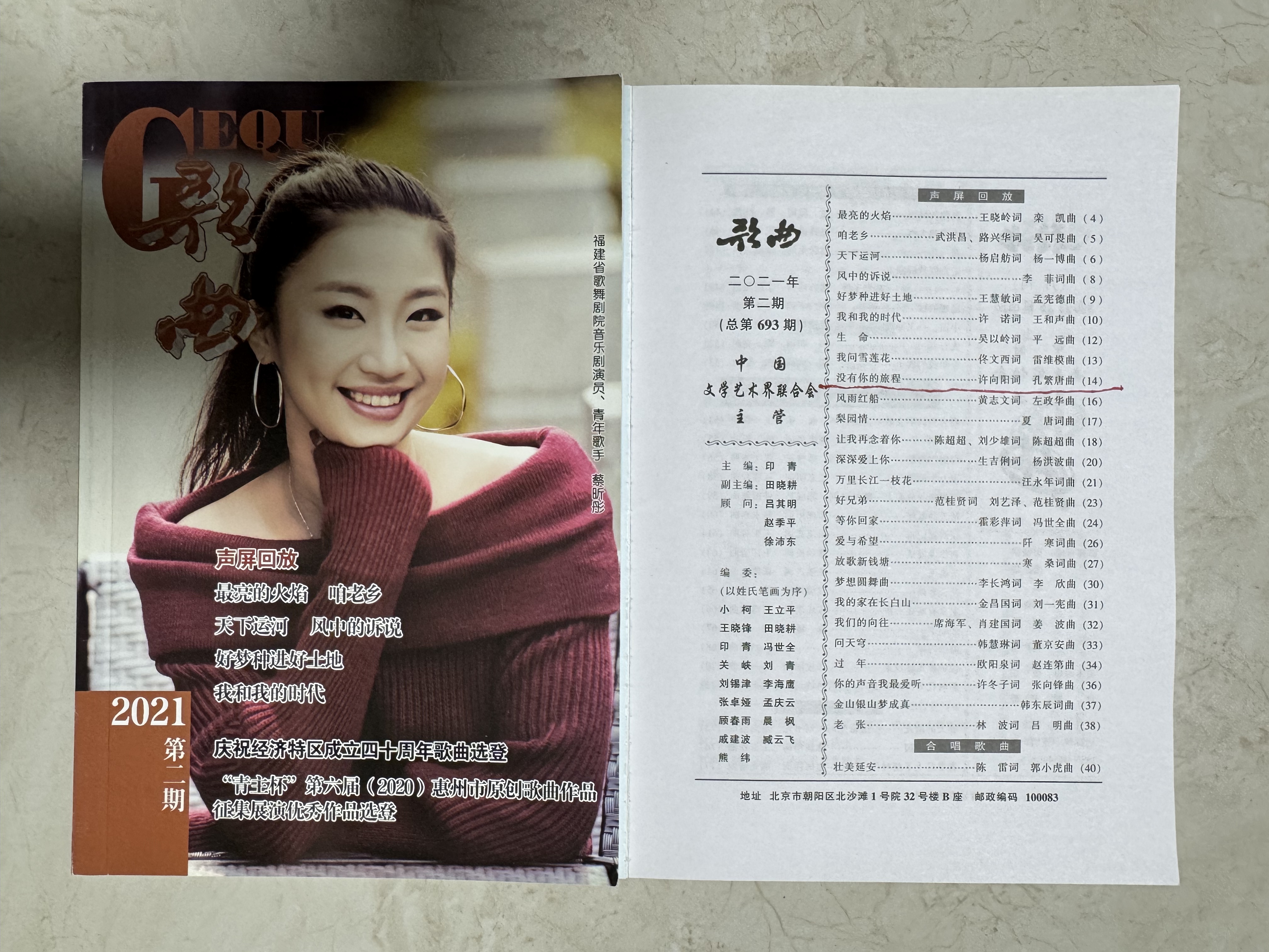 《歌曲》杂志刊发歌曲《没有你的旅程》