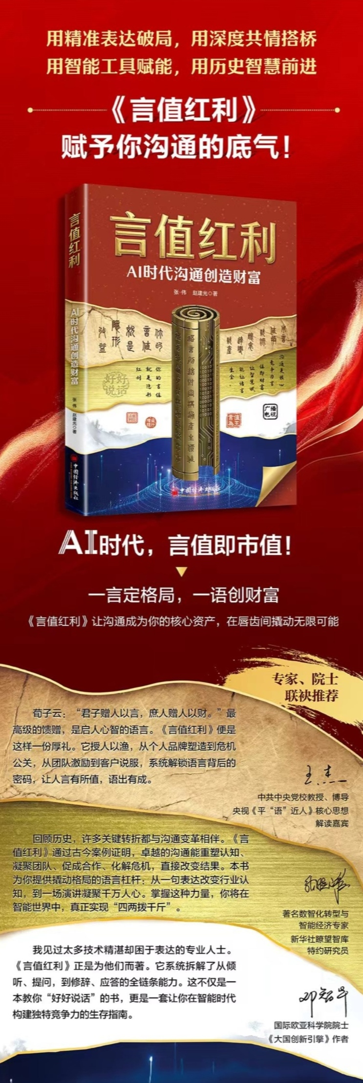 在2026年这个特殊的世界读书日,在全民阅读活动周启幕之际,在“十五五”人工智能+行动全面实施的开局之年,把《言值红利》这本书推荐给每一个愿意在AI时代持续进化的人。毕竟,在技术日益趋同的今天,唯独那些能够用语言打动人心、凝聚共识、创造价值的人,才真正拥有无法被替代的护城河。