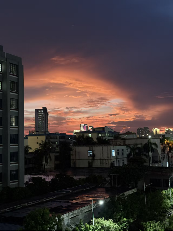 相较于家乡山西,海南最触动人心的,莫过于每日的黄昏。入学第一个傍晚,夕阳沉落,天空如打翻的调色盘——橘红、粉紫、浅金交织流淌,云絮间光泽如丝。同学们纷纷举起手机记录,老师却笑言:“这样的晚霞,海南天天有。”果然,此后每一个傍晚,都有彩霞相伴,或紫或粉,如画笔层层涂抹,教学楼也被镀上金边,与暮色交融。每日穿行校园,沐浴在缤纷霞光中,心灵得以净化,疲惫悄然消散,世界仿佛也温柔下来。