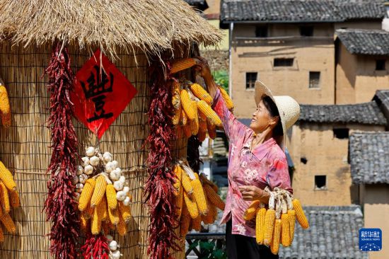 9月17日,安徽黄山歙县阳产村村民在土楼前晾晒农作物。