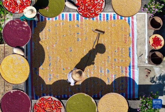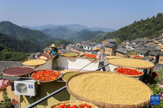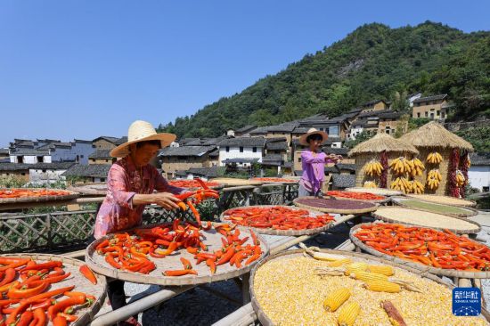 秋收时节,在安徽省黄山市歙县深渡镇阳产村,村民利用晴好天气,抓紧晾晒收获的辣椒、玉米、山核桃等农作物,描绘出一幅山村“晒秋”图。