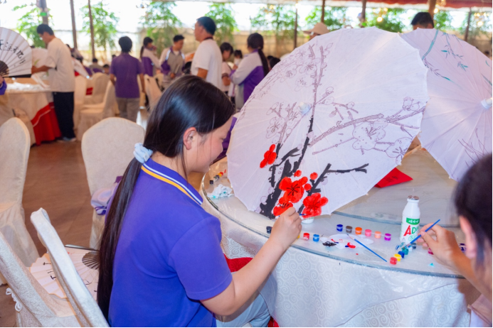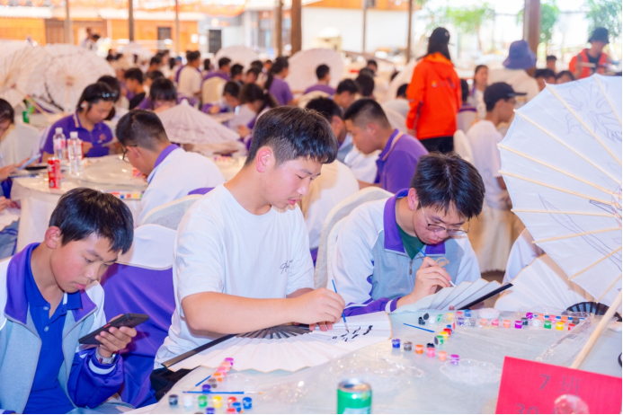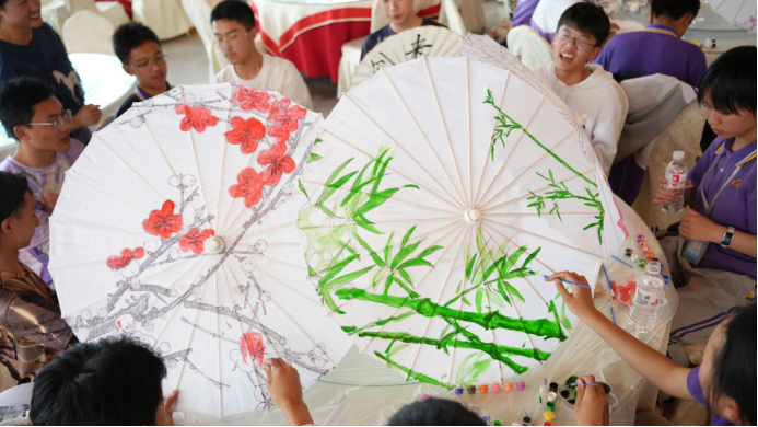 同学们互相合作,绘制出一把把古色古香的油纸伞。伞面上绘着抚仙湖的碧波、春天的花鸟,既是对天然材料的敬畏,也是对东方美学的传承。