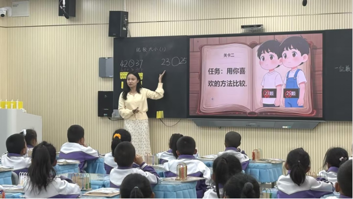杨雪娇老师执教一年级下册《比较大小》。杨老师巧妙融合AI技术,紧密贴合一年级学生认知规律,设计了“小侦探破案记”的趣味任务,引导学生自主探究两位数比较大小的方法,并适时总结归纳方法,课堂逻辑清晰,体现“以学为主”的理念,给予学生充分的思考与交流时间,培养其数学思维与表达能力。
