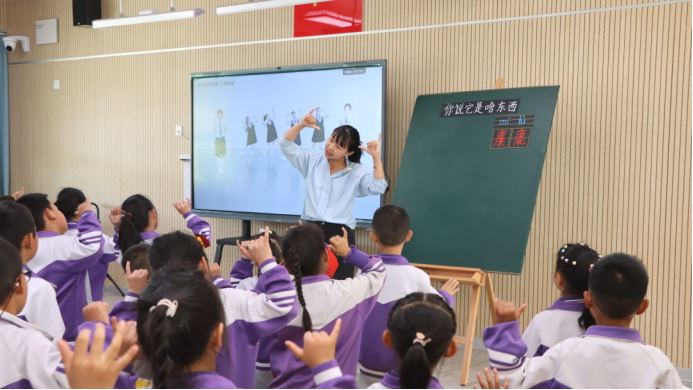 于凡晴老师执教一年级下册《你说它是啥东西》。于老师围绕达斡尔族歌曲学唱、乐器体验、德育渗透三大核心目标,以“激趣导入—感受学唱—实践创编—拓展升华”为主线组织学习活动,搭建猜谜、画线条、音乐律动等学习支架,让学生沉浸到轻松的音乐氛围之中。