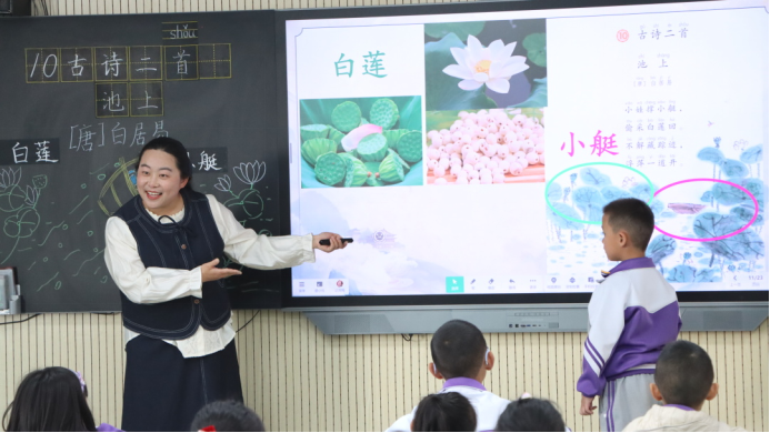 达双梅老师执教一年级下册《池上》。达老师紧扣“多彩的夏日”单元主题,用《江南》旧知导入,构建“识字写字—朗读感悟—想象悟情—背诵积累”的学习任务链,借助AI视频还原古诗画面。以图助解、以读促悟,在多元朗读中随文识字,让学生感受诗词韵律之美和儿童的顽皮可爱。