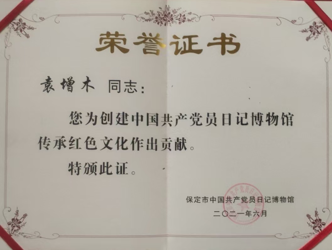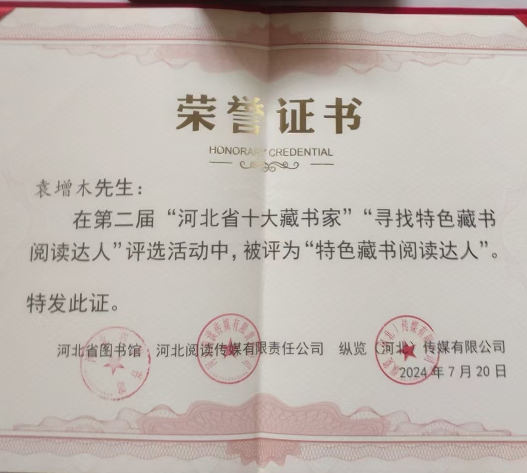 2023年5月,河北省启动了第二届“河北省十大藏书家”暨“寻找特色藏书阅读达人”评选活动,经过严格评审,袁增木于2024年7月荣获“特色藏书阅读达人”称号。