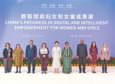 十月十四日上午,全球妇女峰会配套活动“数智赋能妇女和女童成果展”在北京开幕,国家主席习近平夫人、联合国教科文组织促进女童和妇女教育特使彭丽媛同联合国副秘书长兼妇女署执行主任巴胡斯共同出席并致辞,有关外国领导人配偶、妇女组织负责人、友好人士代表等参加。新华社记者 丁 林摄