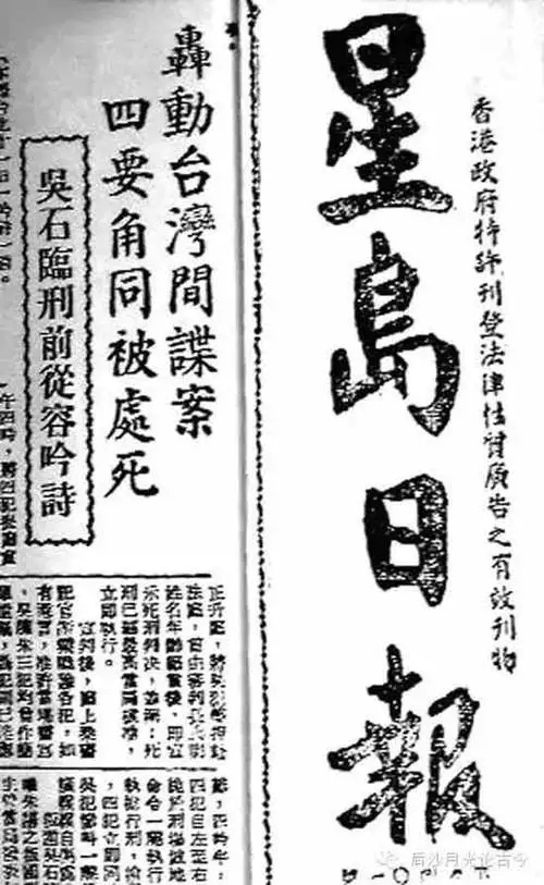 1950年6月,吴石烈士临刑前大义凛然,写下了千古绝句:“凭将一掬丹心在,泉下差堪对我翁”。
